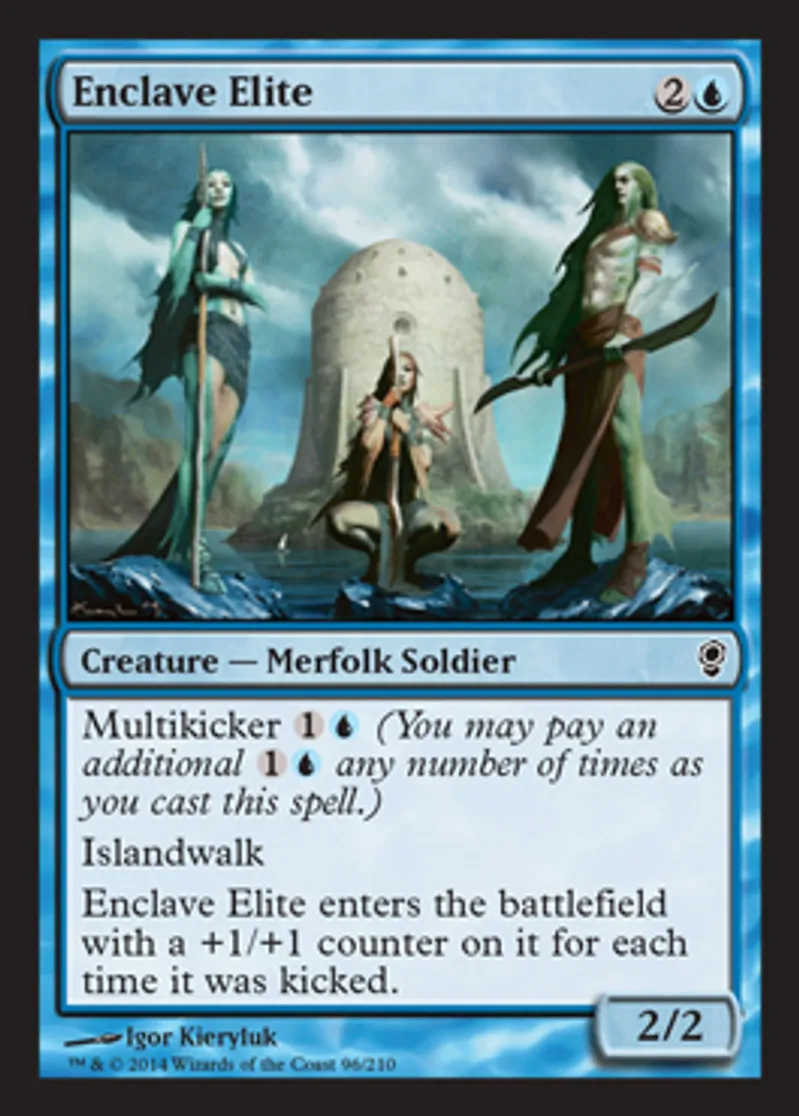 | Oracle Text | Multikicker {{1}}{{u}} (You may pay an additional {{1}}{{u}} any number of times as you cast this spell.) Islandwalk Enclave Elite enters the battlefield with a +1/+1 counter on it for each time it was kicked. | ||