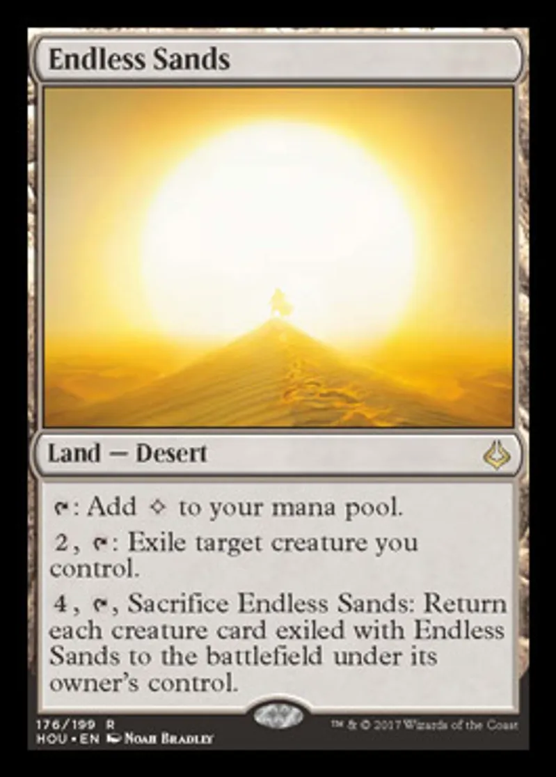 | Oracle Text | {{t}}: Add {{Colorless}} to your mana pool. {{2}}, {{t}}: Exile target creature you control. {{4}}, {{t}}, Sacrifice Endless Sands: Return each creature card exiled with Endless Sands to the battlefield under its owner's control. | ||