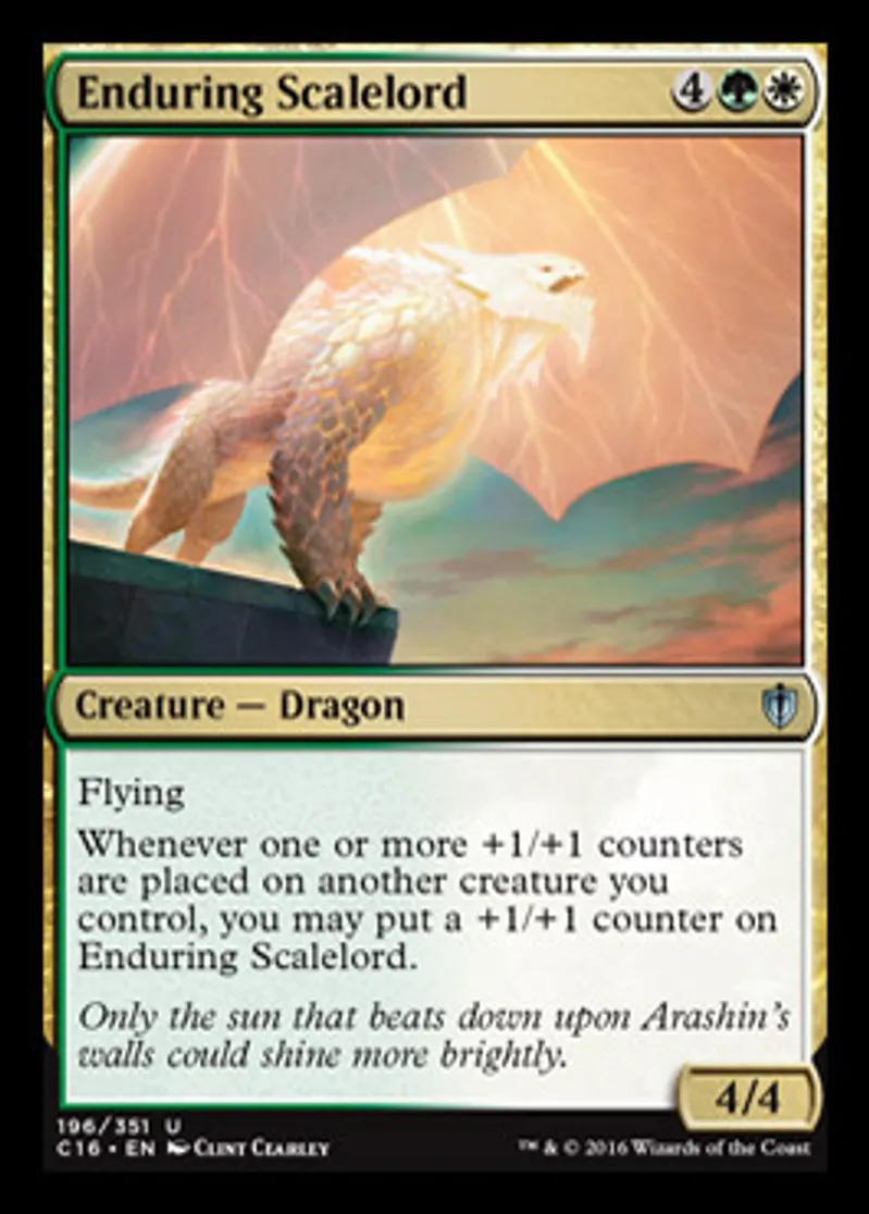 | Oracle Text | Flying Whenever one or more +1/+1 counters are placed on another creature you control, you may put a +1/+1 counter on Enduring Scalelord. | ||
