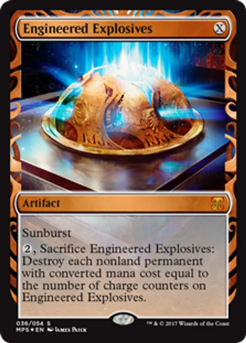| Oracle Text | Sunburst (This enters the battlefield with a charge counter on it for each color of mana spent to cast it.) {{2}}, Sacrifice Engineered Explosives: Destroy each nonland permanent with converted mana cost equal to the number of charge counters on Engineered Explosives. | ||