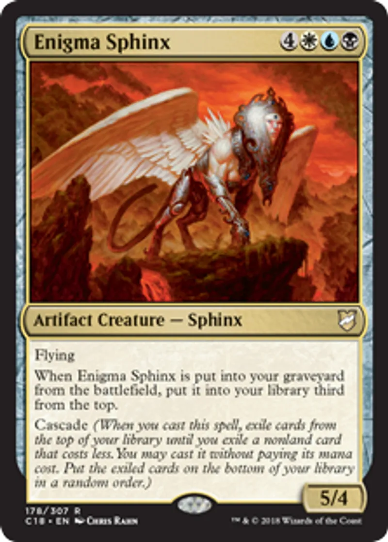 | Oracle Text | Flying When Enigma Sphinx is put into your graveyard from the battlefield, put it into your library third from the top. Cascade (When you cast this spell, exile cards from the top of your library until you exile a nonland card that costs less. You may cast it without paying its mana cost. Put the exiled cards on the bottom of your library in a random order.) | ||