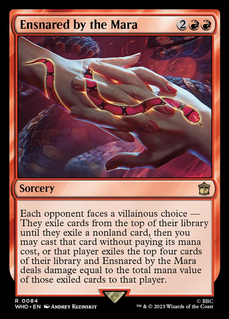 | Oracle Text | Each opponent faces a villainous choice — They exile cards from the top of their library until they exile a nonland card, then you may cast that card without paying its mana cost, or that player exiles the top four cards of their library and Ensnared by the Mara deals damage equal to the total mana value of those exiled cards to that player. | ||