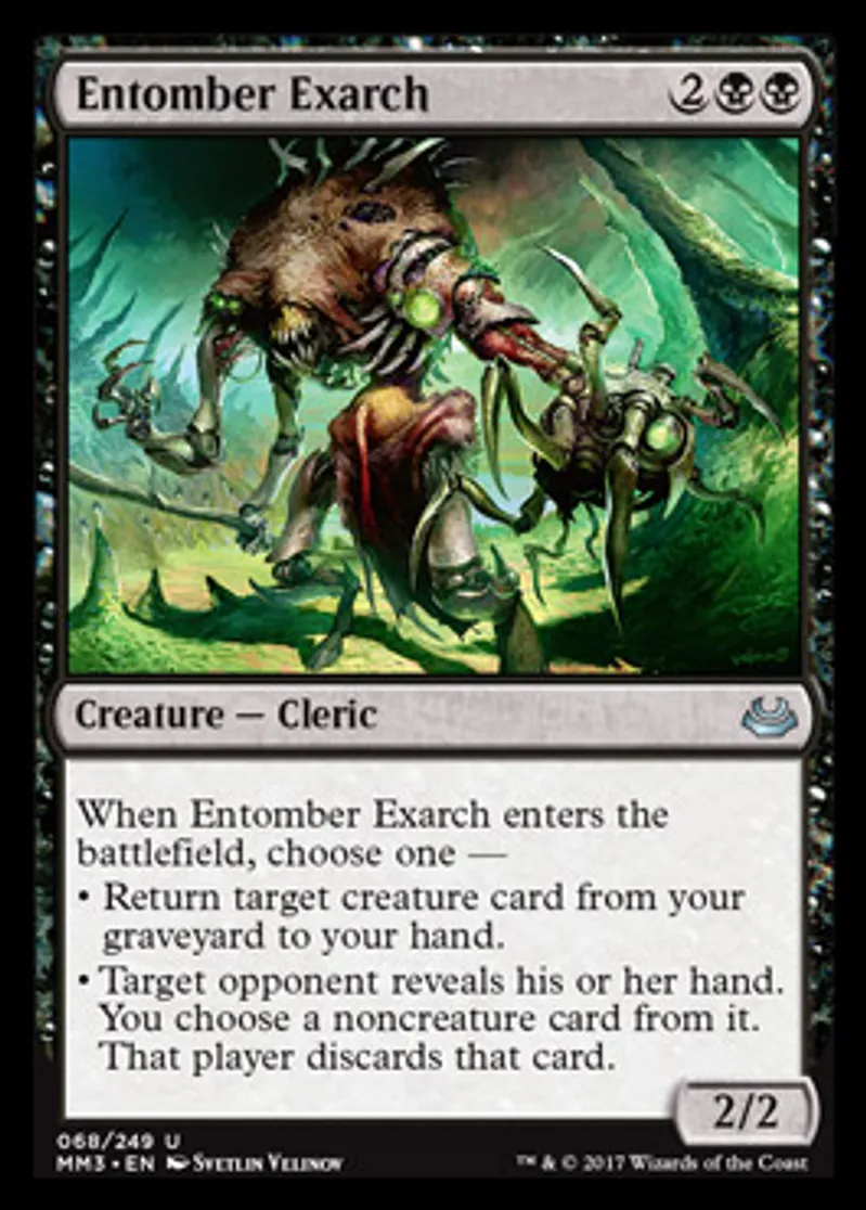 | Oracle Text | When Entomber Exarch enters the battlefield, choose one — • Return target creature card from your graveyard to your hand. • Target opponent reveals his or her hand. You choose a noncreature card from it. That player discards that card. | ||