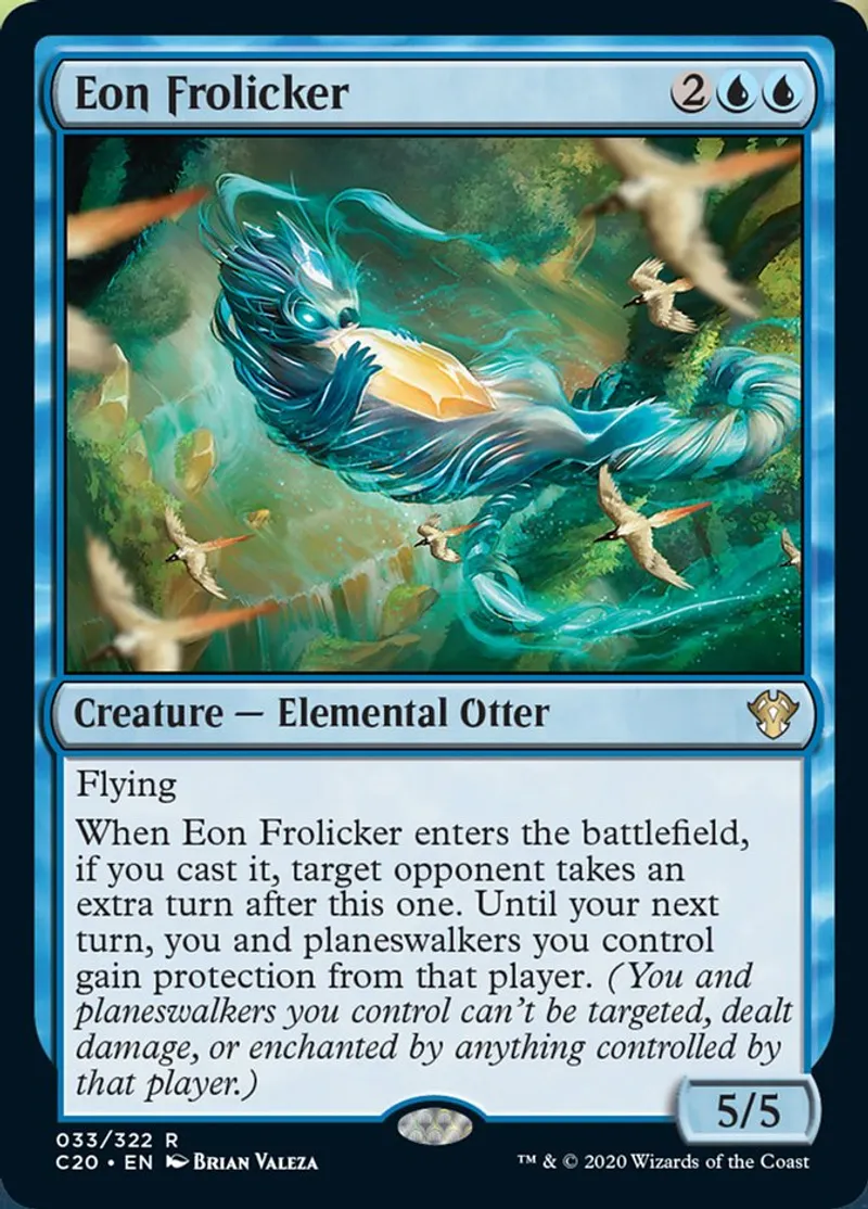 When Eon Frolicker enters the battlefield, if you cast it, target opponent takes an extra turn after this one. Until your next turn, you and planeswalkers you control gain protection from that player. (You and planeswalkers you control can't be targeted, dealt damage, or enchanted by anything controlled by that player.) | ||