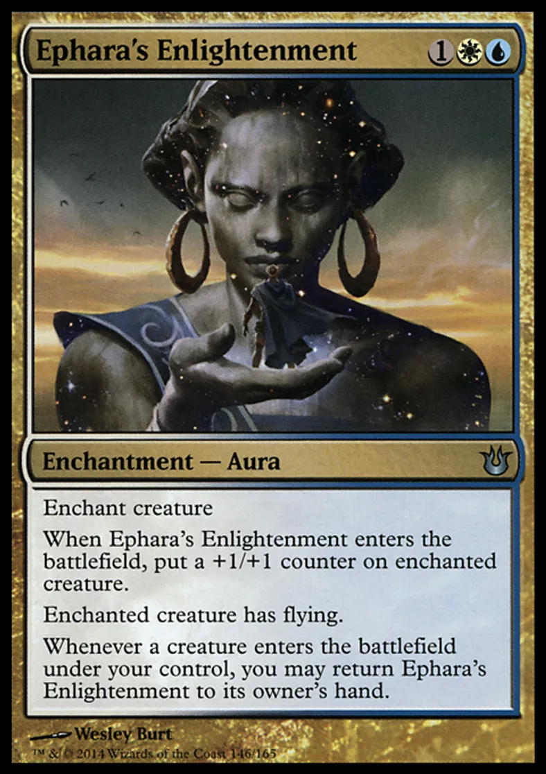 | Oracle Text | Enchant creature When Ephara's Enlightenment enters the battlefield, put a +1/+1 counter on enchanted creature. Enchanted creature has flying. Whenever a creature enters the battlefield under your control, you may return Ephara's Enlightenment to its owner's hand. | ||