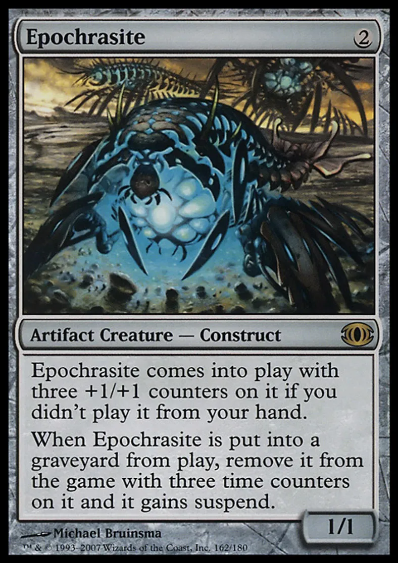 | Oracle Text | Epochrasite enters the battlefield with three +1/+1 counters on it if you didn't cast it from your hand. When Epochrasite dies, exile it with three time counters on it and it gains suspend. (At the beginning of your upkeep, remove a time counter. When the last is removed, cast this card without paying its mana cost. It has haste.) | ||