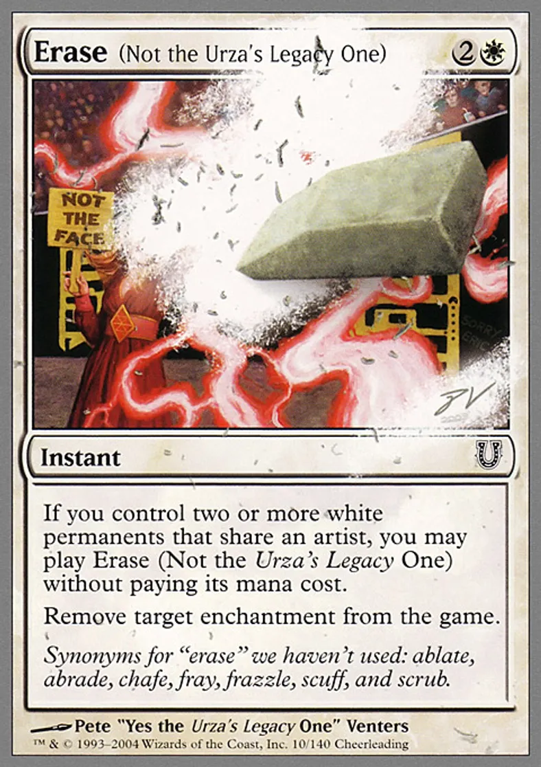 | Oracle Text | If you control two or more white permanents that share an artist, you may play Erase (Not the Urza's Legacy One) without paying its mana cost. Remove target enchantment from the game. | ||
