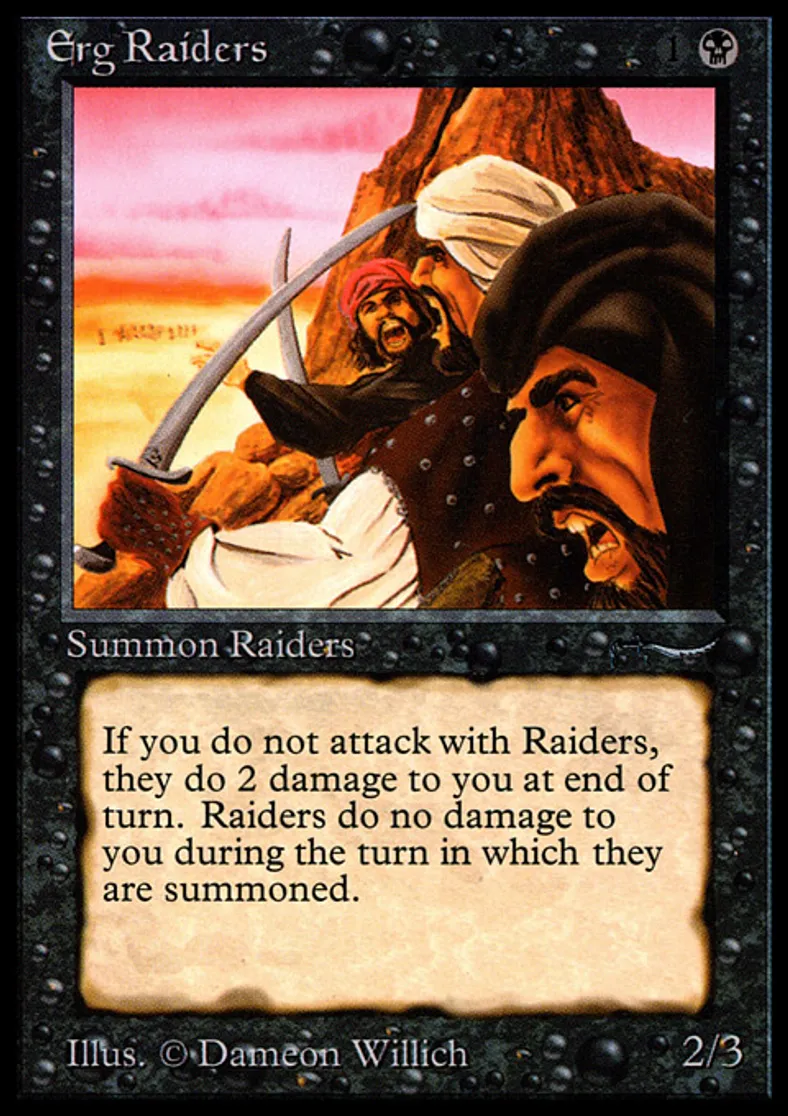 | Oracle Text | At the beginning of your end step, if Erg Raiders didn't attack this turn, Erg Raiders deals 2 damage to you unless it came under your control this turn. | ||