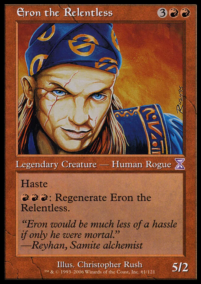 | Oracle Text | Haste {{r}}{{r}}{{r}}: Regenerate Eron the Relentless. | ||