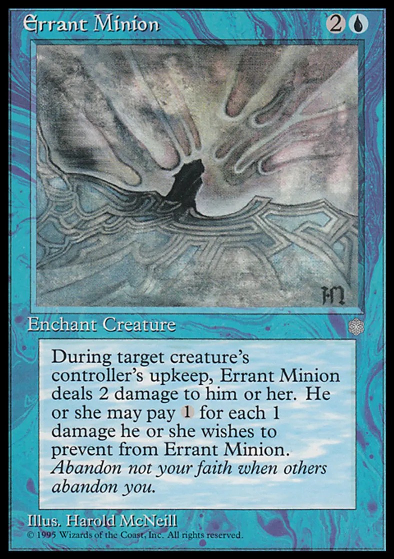 | Oracle Text | Enchant creature At the beginning of the upkeep of enchanted creature's controller, that player may pay any amount of mana. Errant Minion deals 2 damage to that player. Prevent X of that damage, where X is the amount of mana that player paid this way. | ||