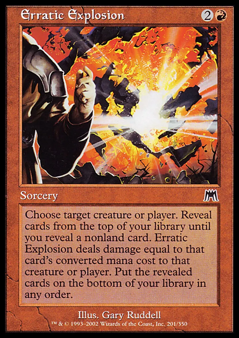 | Oracle Text | Choose target creature or player. Reveal cards from the top of your library until you reveal a nonland card. Erratic Explosion deals damage equal to that card's converted mana cost to that creature or player. Put the revealed cards on the bottom of your library in any order. | ||