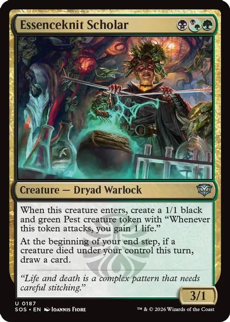 Magic: the Gathering (mtg) Uncommon creature — dryad warlock Essenceknit Scholar from Secrets of Strixhaven (SOS) last updated 2026-04-16 23:17:36