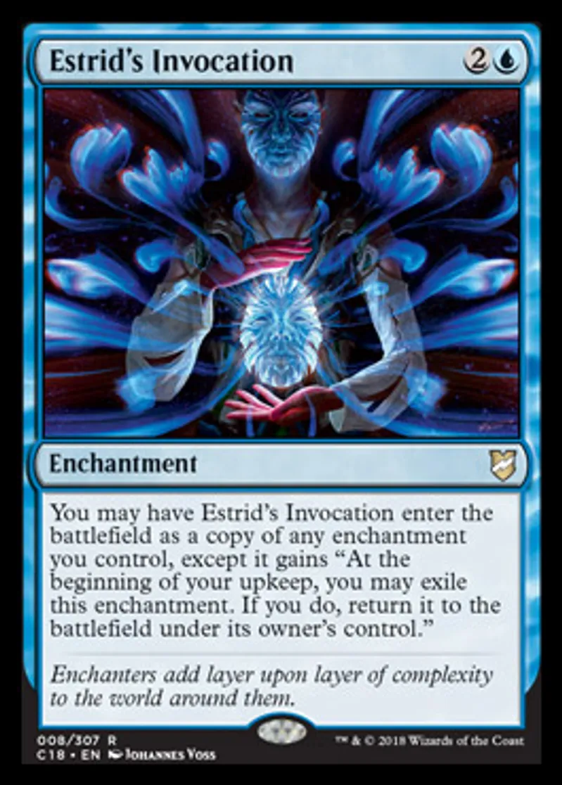 | Oracle Text | You may have Estrid's Invocation enter the battlefield as a copy of any enchantment you control, except it has "At the beginning of your upkeep, you may exile this enchantment. If you do, return it to the battlefield under its owner's control." | ||