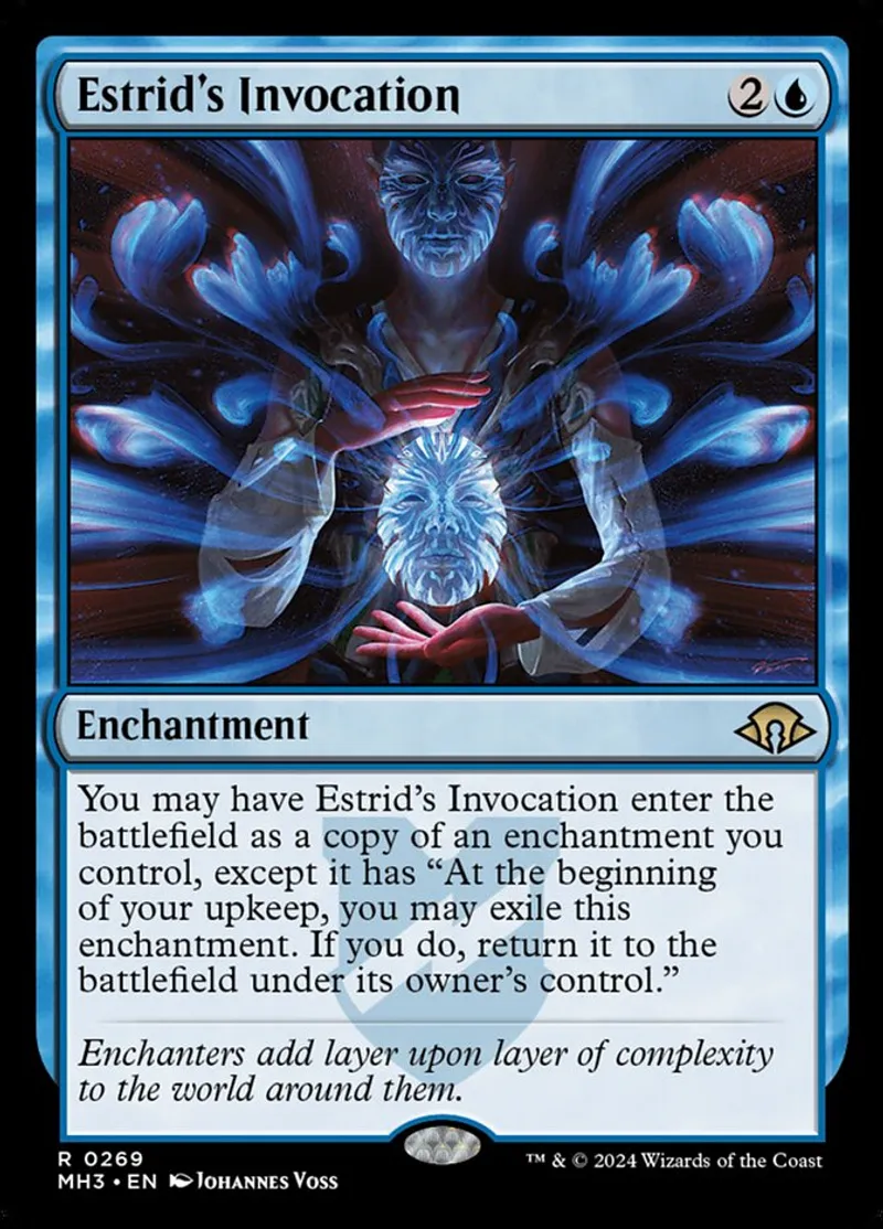 | Oracle Text | You may have Estrid's Invocation enter the battlefield as a copy of an enchantment you control, except it has "At the beginning of your upkeep, you may exile this enchantment. If you do, return it to the battlefield under its owner's control." | ||