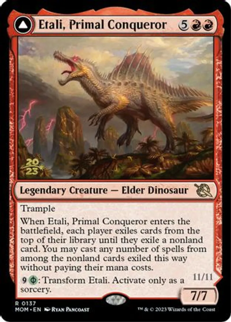 When Etali, Primal Conqueror enters the battlefield, each player exiles cards from the top of their library until they exile a nonland card. You may cast any number of spells from among the nonland cards exiled this way without paying their mana costs.