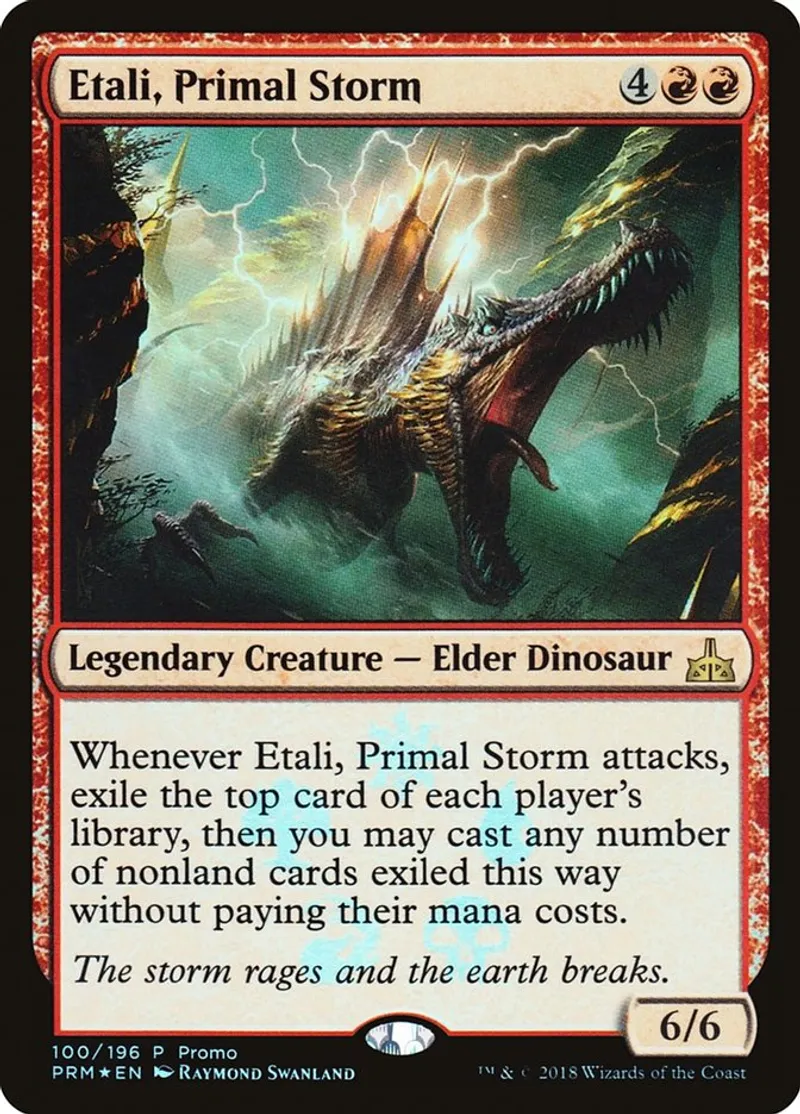 | Oracle Text | Whenever Etali, Primal Storm attacks, exile the top card of each player\'s library, then you may cast any number of nonland cards exiled this way without paying their mana costs. | ||