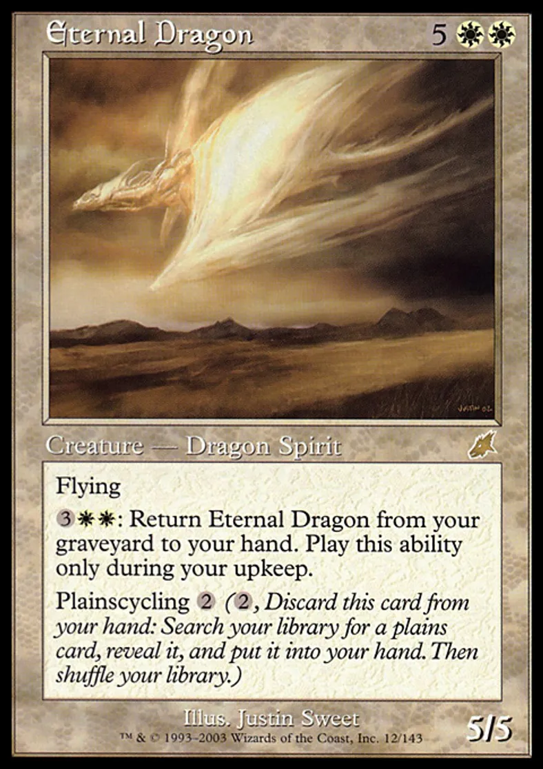 | Oracle Text | Flying {{3}}{{w}}{{w}}: Return Eternal Dragon from your graveyard to your hand. Activate this ability only during your upkeep. Plainscycling {{2}} ({{2}}, Discard this card: Search your library for a Plains card, reveal it, and put it into your hand. Then shuffle your library.) | ||