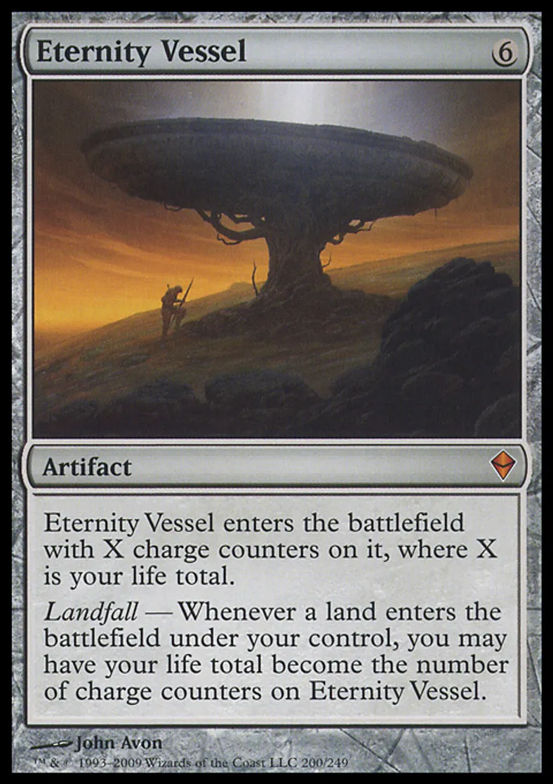 | Oracle Text | Eternity Vessel enters the battlefield with X charge counters on it, where X is your life total. Landfall — Whenever a land enters the battlefield under your control, you may have your life total become the number of charge counters on Eternity Vessel. | ||