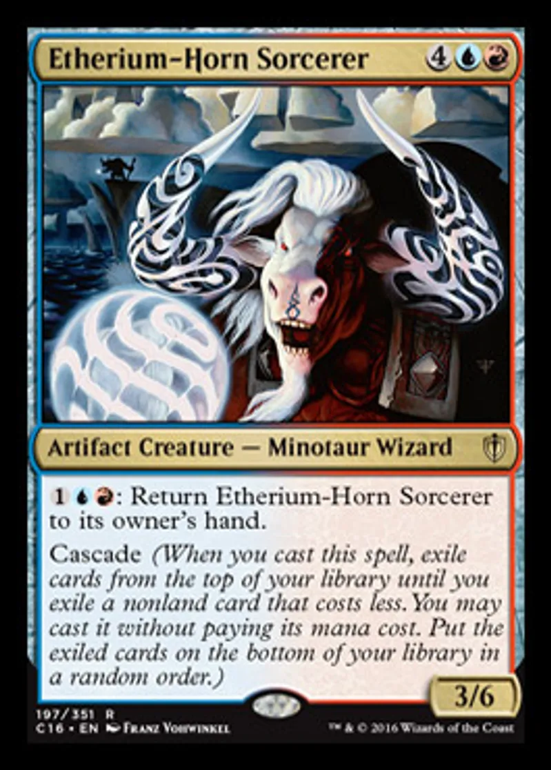 | Oracle Text | {{1}}{{u}}{{r}}: Return Etherium-Horn Sorcerer to its owner's hand. Cascade (When you cast this spell, exile cards from the top of your library until you exile a nonland card that costs less. You may cast it without paying its mana cost. Put the exiled cards on the bottom of your library in a random order.) | ||
