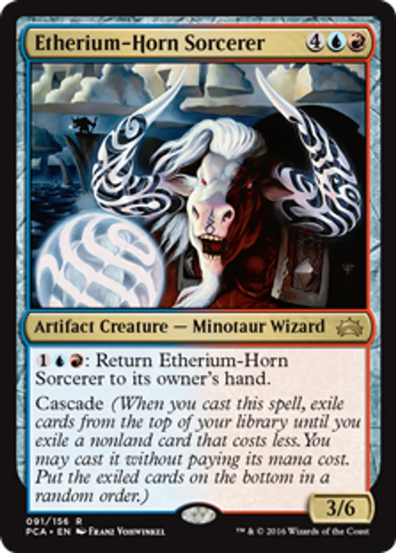 | Oracle Text | {{1}}{{u}}{{r}}: Return Etherium-Horn Sorcerer to its owner's hand. Cascade (When you cast this spell, exile cards from the top of your library until you exile a nonland card that costs less. You may cast it without paying its mana cost. Put the exiled cards on the bottom of your library in a random order.) | ||