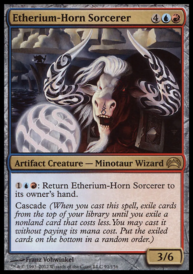 | Oracle Text | {{1}}{{u}}{{r}}: Return Etherium-Horn Sorcerer to its owner's hand. Cascade (When you cast this spell, exile cards from the top of your library until you exile a nonland card that costs less. You may cast it without paying its mana cost. Put the exiled cards on the bottom in a random order.) | ||