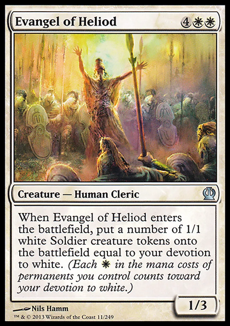 | Oracle Text | When Evangel of Heliod enters the battlefield, put a number of 1/1 white Soldier creature tokens onto the battlefield equal to your devotion to white. (Each {{w}} in the mana costs of permanents you control counts toward your devotion to white.) | ||