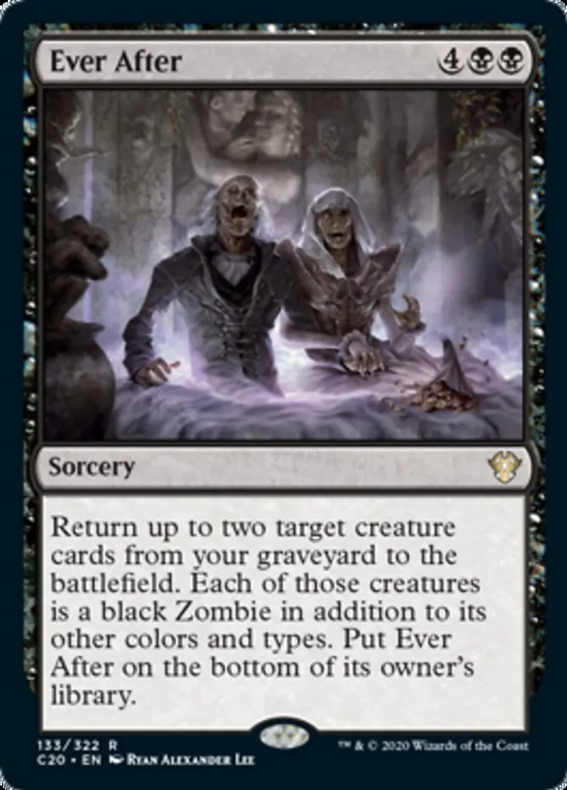 | Oracle Text | Return up to two target creature cards from your graveyard to the battlefield. Each of those creatures is a black Zombie in addition to its other colors and types. Put Ever After on the bottom of its owner's library. | ||