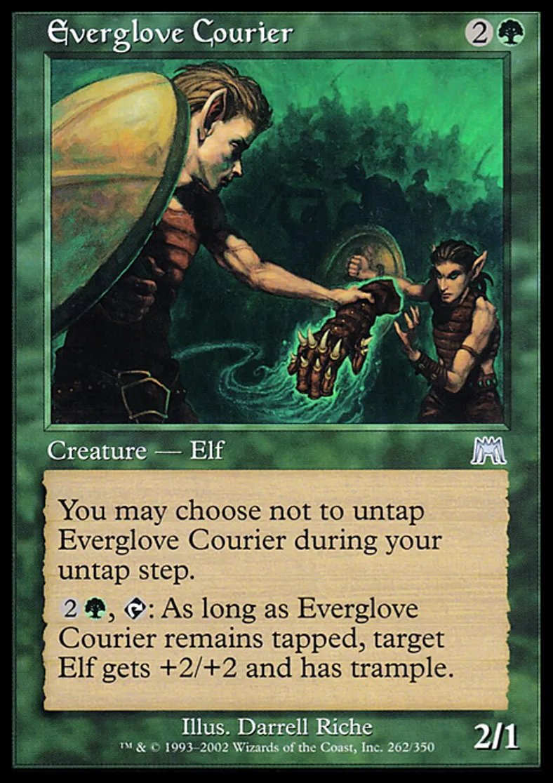 | Oracle Text | You may choose not to untap Everglove Courier during your untap step. {{2}}{{g}}, {{t}}: Target Elf creature gets +2/+2 and has trample for as long as Everglove Courier remains tapped. | ||