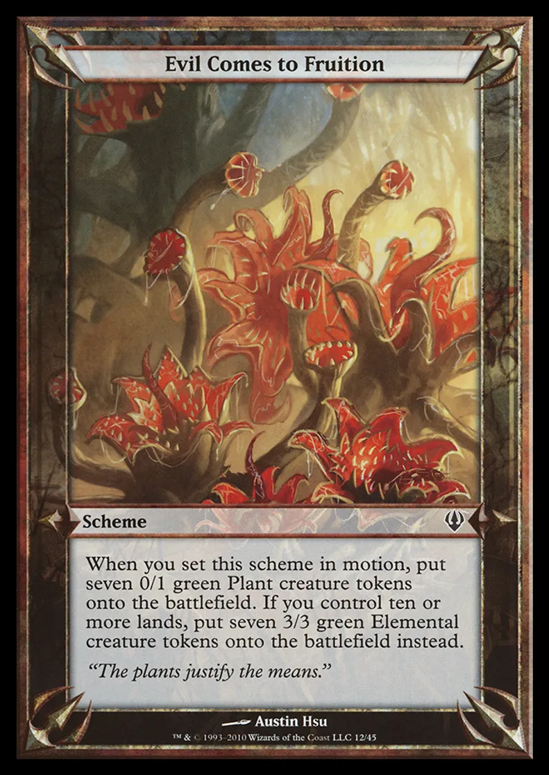 | Oracle Text | When you set this scheme in motion, put seven 0/1 green Plant creature tokens onto the battlefield. If you control ten or more lands, put seven 3/3 green Elemental creature tokens onto the battlefield instead. | ||