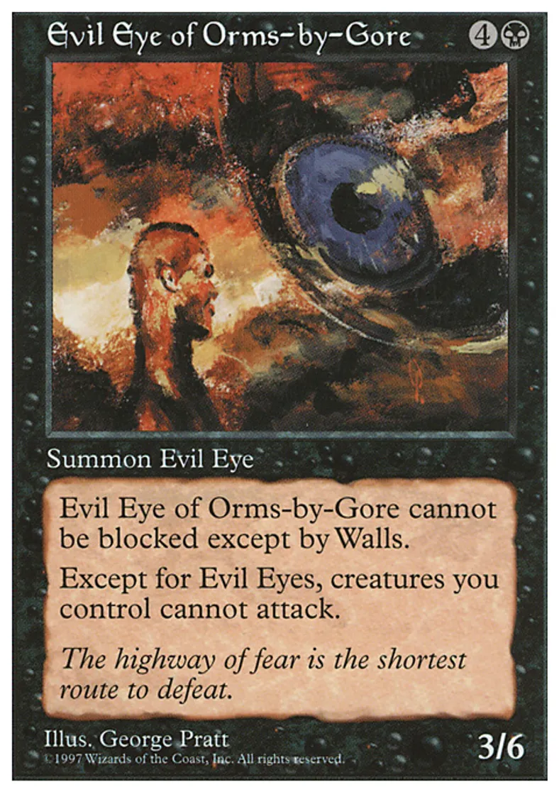 | Oracle Text | Non-Eye creatures you control can't attack. Evil Eye of Orms-by-Gore can't be blocked except by Walls. | ||