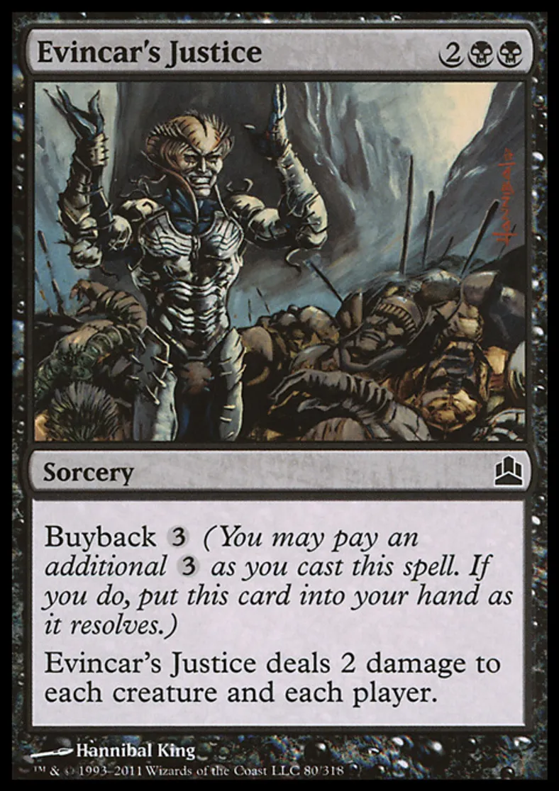 | Oracle Text | Buyback {{3}} (You may pay an additional {{3}} as you cast this spell. If you do, put this card into your hand as it resolves.) Evincar's Justice deals 2 damage to each creature and each player. | ||