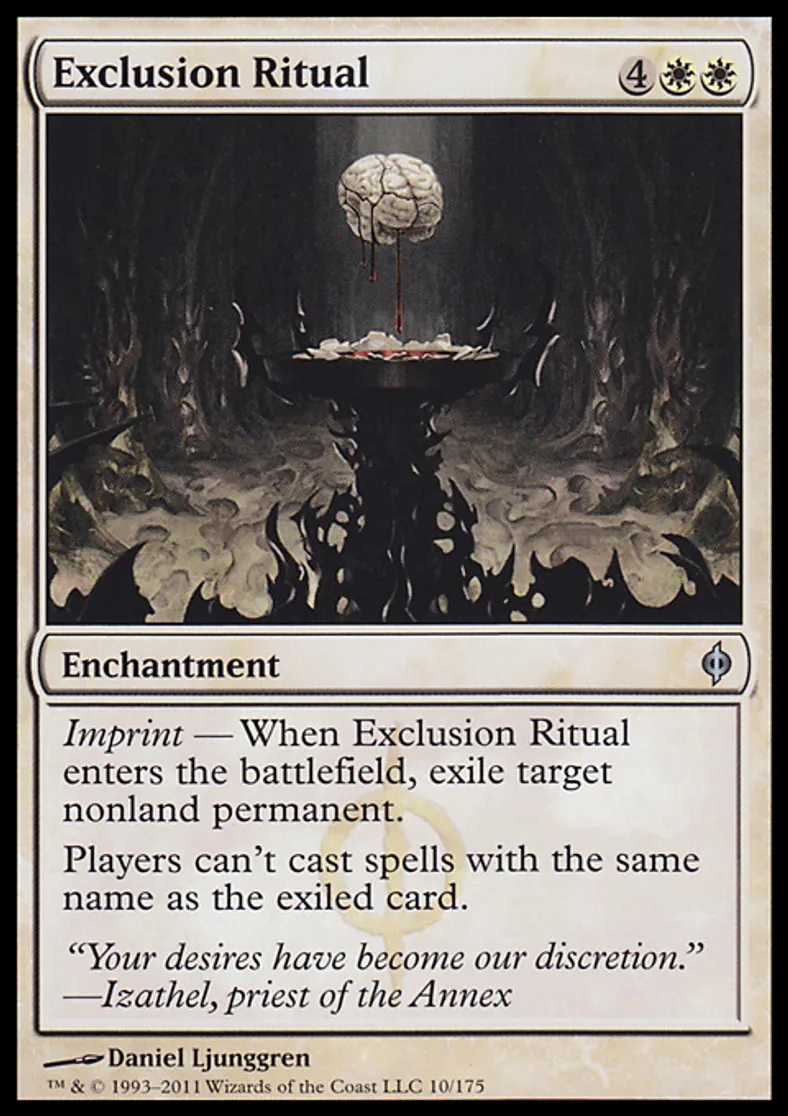 | Oracle Text | Imprint — When Exclusion Ritual enters the battlefield, exile target nonland permanent. Players can't cast spells with the same name as the exiled card. | ||