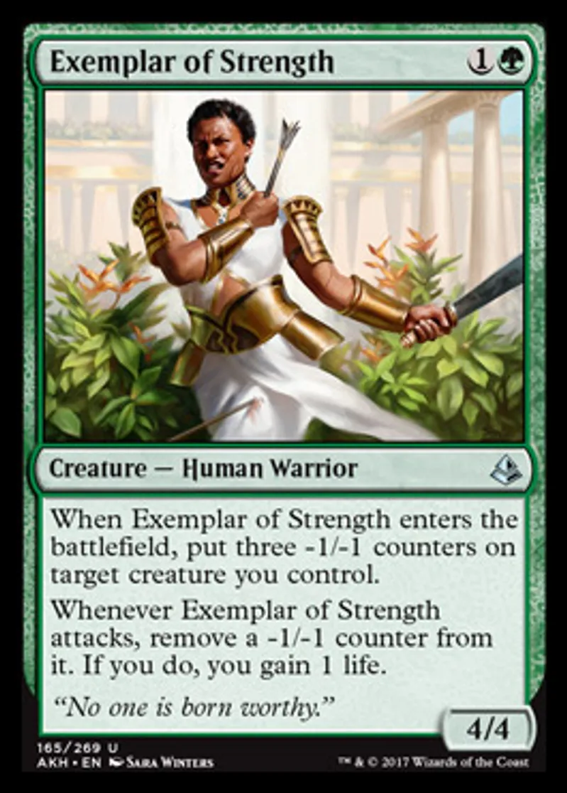 | Oracle Text | When Exemplar of Strength enters the battlefield, put three -1/-1 counters on target creature you control. Whenever Exemplar of Strength attacks, remove a -1/-1 counter from it. If you do, you gain 1 life. | ||