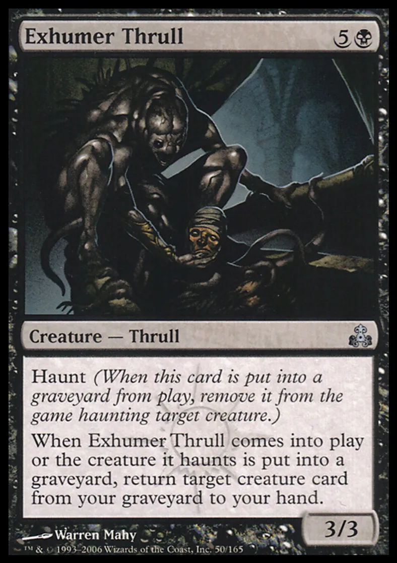| Oracle Text | Haunt (When this creature dies, exile it haunting target creature.) When Exhumer Thrull enters the battlefield or the creature it haunts dies, return target creature card from your graveyard to your hand. | ||