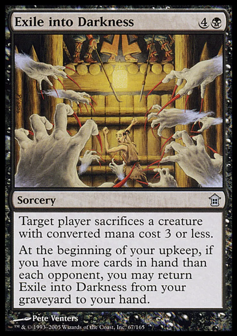 | Oracle Text | Target player sacrifices a creature with converted mana cost 3 or less. At the beginning of your upkeep, if you have more cards in hand than each opponent, you may return Exile into Darkness from your graveyard to your hand. | ||