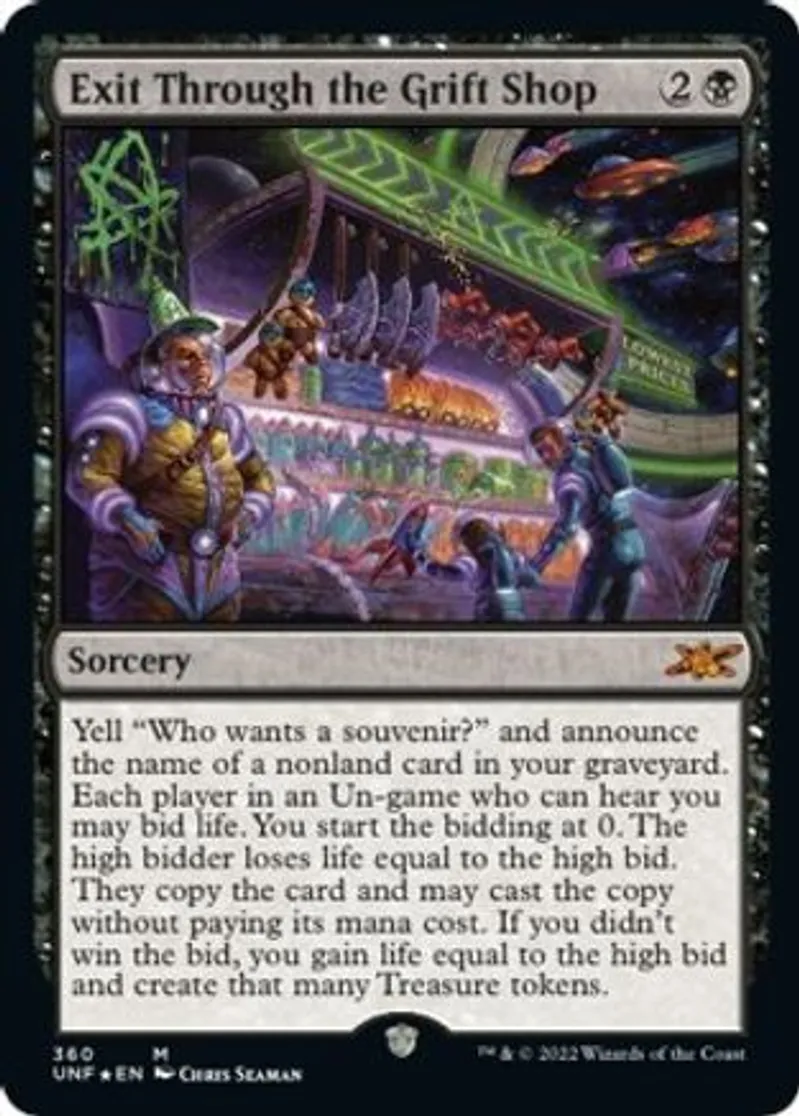 Magic: the Gathering (mtg) Mythic Rare Sorcery Exit Through the Grift Shop from Unfinity (UNF) last updated 2026-02-21 16:13:01