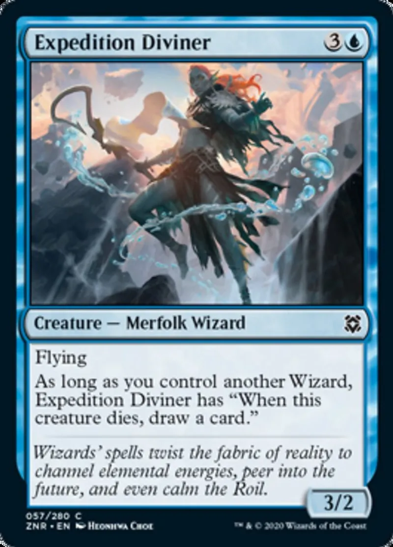 As long as you control another Wizard, Expedition Diviner has "When this creature dies, draw a card." | ||