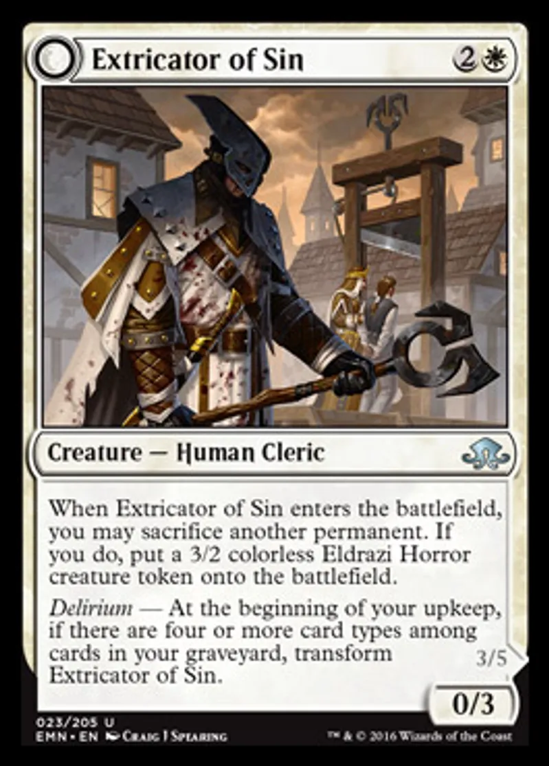 | Oracle Text | When Extricator of Sin enters the battlefield, you may sacrifice another permanent. If you do, put a 3/2 colorless Eldrazi Horror creature token onto the battlefield. Delirium — At the beginning of your upkeep, if there are four or more card types among cards in your graveyard, transform Extricator of Sin. | ||