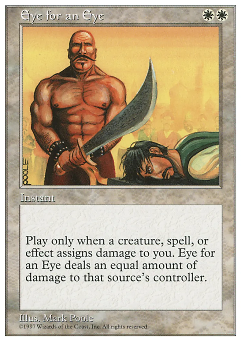 | Oracle Text | The next time a source of your choice would deal damage to you this turn, instead that source deals that much damage to you and Eye for an Eye deals that much damage to that source's controller. | ||