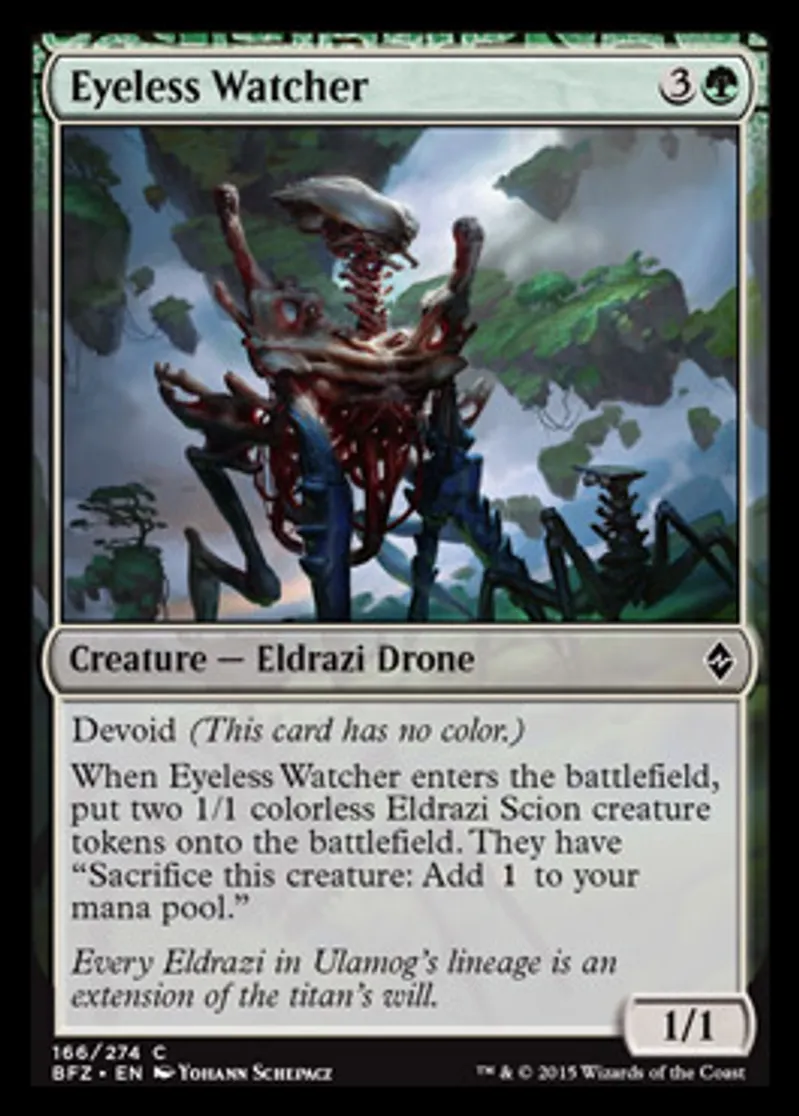 | Oracle Text | Devoid (This card has no color.) When Eyeless Watcher enters the battlefield, put two 1/1 colorless Eldrazi Scion creature tokens onto the battlefield. They have "Sacrifice this creature: Add {{1}} to your mana pool." | ||
