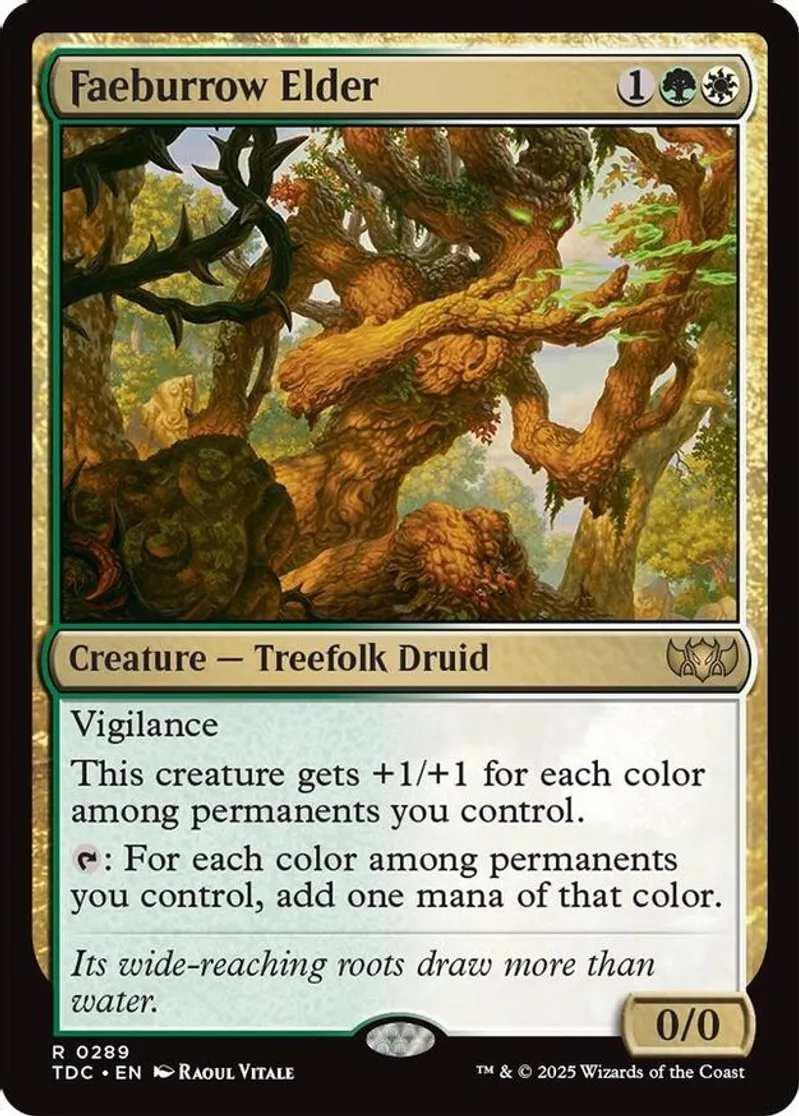 Magic: the Gathering (mtg) Rare creature — treefolk druid Faeburrow Elder from Commander: Tarkir: Dragonstorm (TDC) last updated 2026-02-24 15:21:02