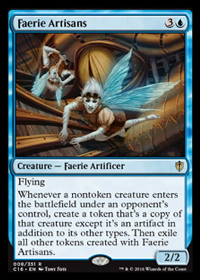 | Oracle Text | Flying Whenever a nontoken creature enters the battlefield under an opponent's control, create a token that's a copy of that creature except it's an artifact in addition to its other types. Then exile all other tokens created with Faerie Artisans. | ||
