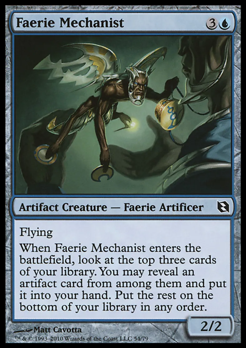 | Oracle Text | Flying When Faerie Mechanist enters the battlefield, look at the top three cards of your library. You may reveal an artifact card from among them and put it into your hand. Put the rest on the bottom of your library in any order. | ||