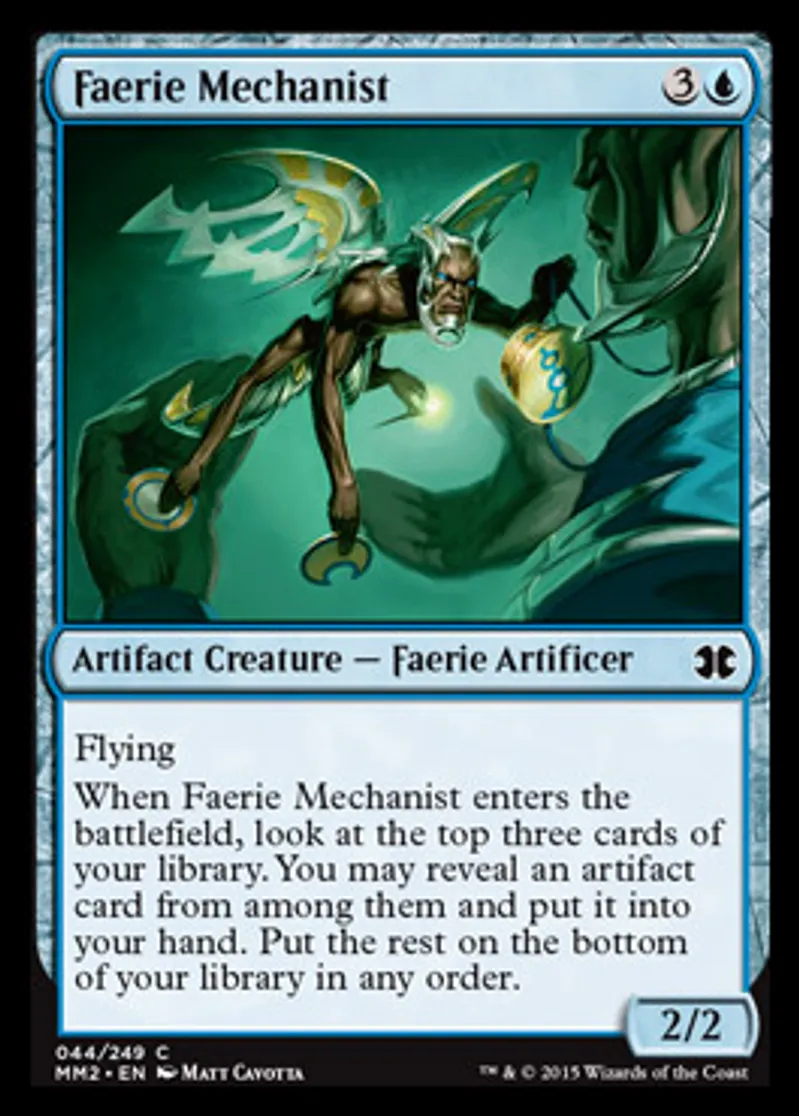 | Oracle Text | Flying When Faerie Mechanist enters the battlefield, look at the top three cards of your library. You may reveal an artifact card from among them and put it into your hand. Put the rest on the bottom of your library in any order. | ||