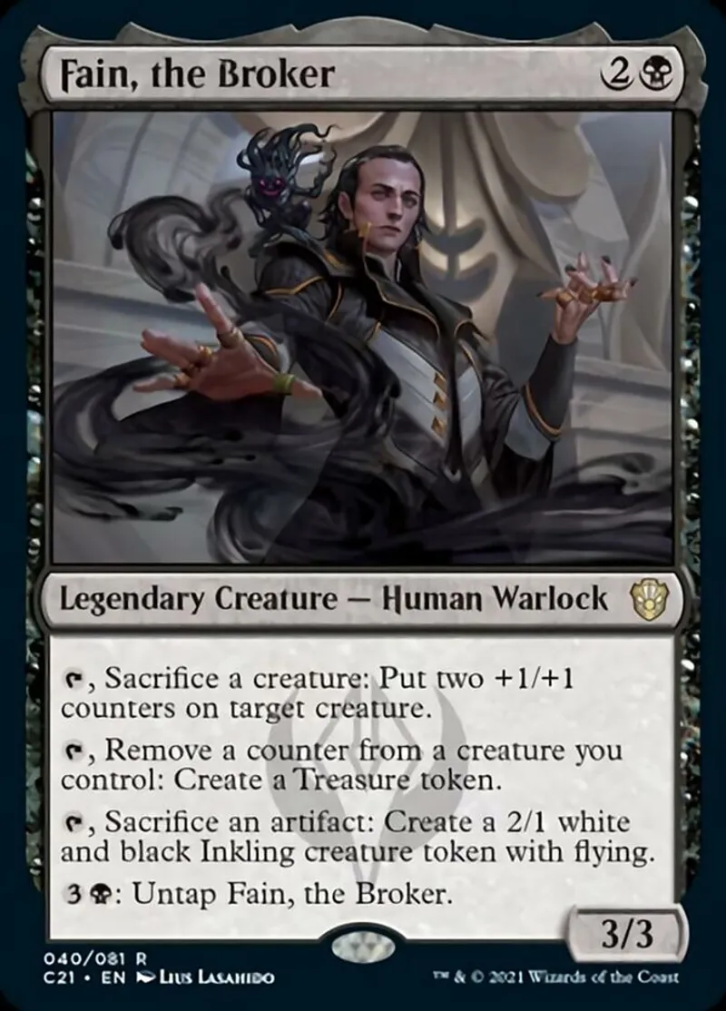 Magic: the Gathering (mtg) rare Legendary Creature — Human Warlock Fain, the Broker from Commander 2021 (c21) last updated 2026-02-25 15:04:32