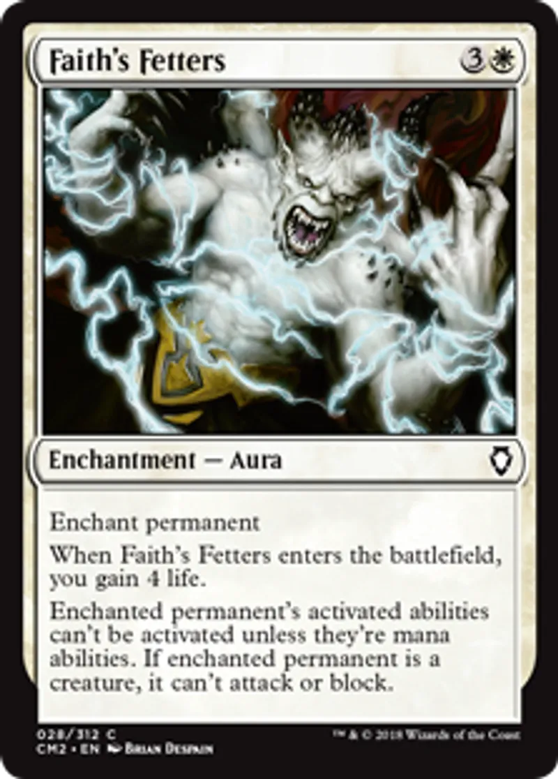 | Oracle Text | Enchant permanent When Faith's Fetters enters the battlefield, you gain 4 life. Enchanted permanent can't attack or block, and its activated abilities can't be activated unless they're mana abilities. | ||