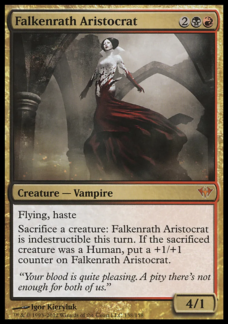 | Oracle Text | Flying, haste Sacrifice a creature: Falkenrath Aristocrat gains indestructible until end of turn. If the sacrificed creature was a Human, put a +1/+1 counter on Falkenrath Aristocrat. | ||