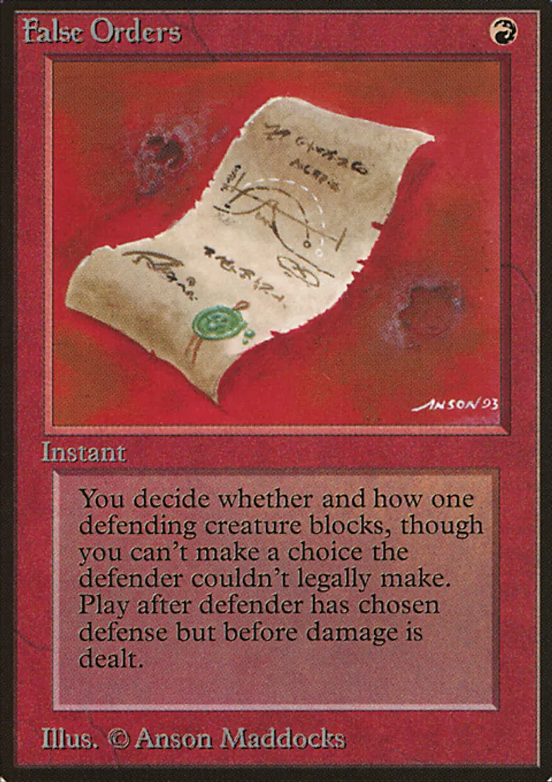 | Oracle Text | Cast False Orders only during the declare blockers step. Remove target creature defending player controls from combat. Creatures it was blocking that had become blocked by only that creature this combat become unblocked. You may have it block an attacking creature of your choice. | ||