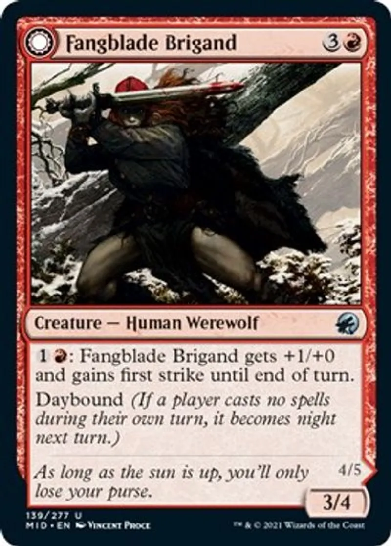 Magic: the Gathering (mtg) Uncommon Creature — Human Werewolf Fangblade Brigand from Innistrad: Midnight Hunt (mid) last updated 2026-02-21 16:41:32