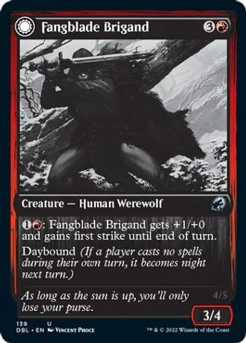 Magic: the Gathering (mtg) Mythic Rare Creature — Human Werewolf Fangblade Brigand from Innistrad: Double Feature (dbl) last updated 2026-02-21 15:39:32